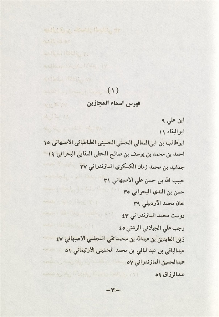 رتبت حسب الترتيب الحروفي لأسماء المجازين مع اضافة تراجم قصيرة لهم بأن يذكر المترجم باسمه ويترجم بما تيسر مع العناية بما قرأه لدى المجلسي، ثم تثبت الاجازة أو الاجازات التی كتبها له تباعاً ، مع رقم خاص للمجازين الذين بلغوا (84) شخصاً ورقم مسلسل للاجازات التي بلغت (115) اجازة .