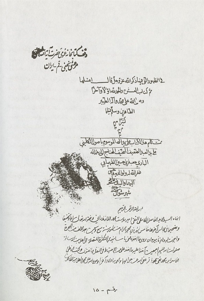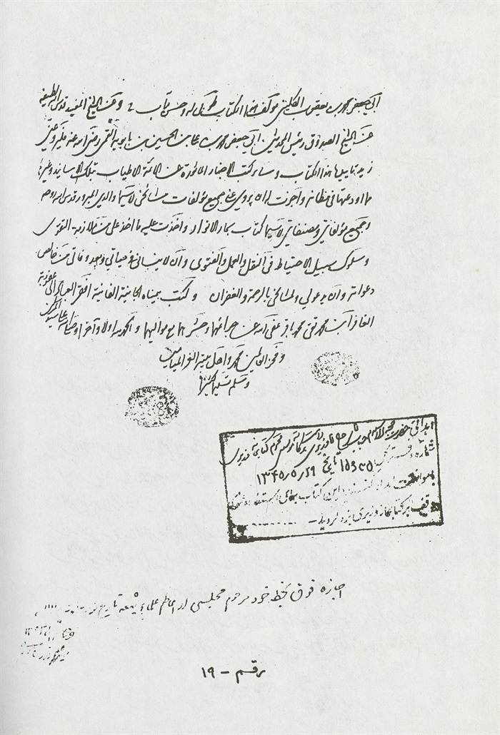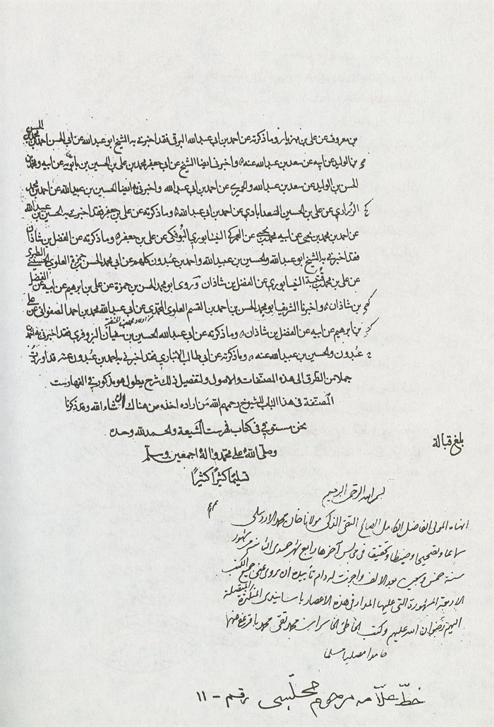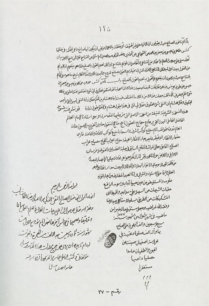 وكتب بيمناه الداثرة أفقر عباد اللّٰه محمد باقر بن محمد تقي عفي عنهما بالنبي وآله المطهرين، حامدا مصليا مسلما.