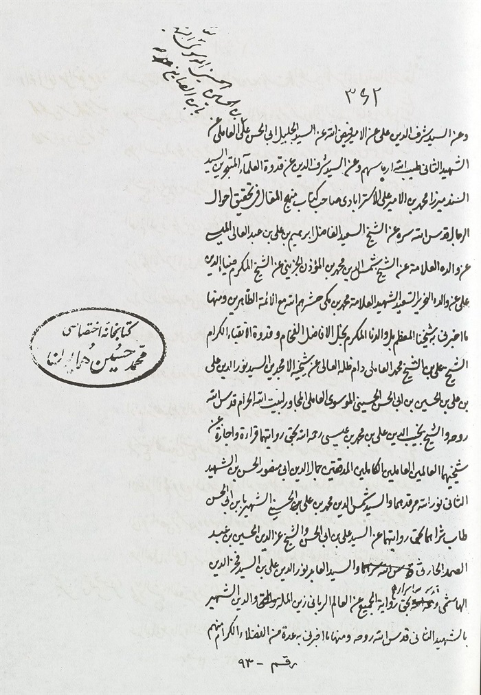 فأجزت له بعد الاستخارة أن يرويها عني، لا سيما الكتب الأربعة لأبي جعفرين المحمدين الثلاثة رضي اللّٰه عنهم وشكر اللّٰه مساعيهم، بأسانيدي العديدة المتصلة إلي مؤلفيها، آخذا عليه ما أخذ علي من ملازمة التقوي وسلوك سبيل أئمة الهدي عليهم الصلاة والسلام، وعدم الميل إلي طريق أهل الضلالة والعدي وان مال إليها أهل الهوي التاركين الآخرة للدنيا، وأن لا ينساني في خلواته وأن يستغفر لي في حياتي وبعد موتي.