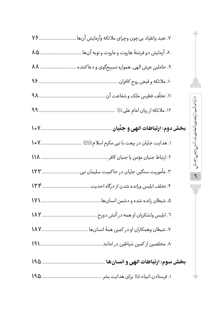 مندرجات:ج.1و 2. ارتباطات الهی و عالم هستی.- ج.3. ارتباطات و تعاملات انبیاء علیهم السلام.- ج.4 - 6. ارتباطات و تعاملات انبیاء، ائمه و اولیاء علیهم السلام.- ج.7 و 8. ارتباطات و تعاملات انسان با خداوند متعال.- ج.9. ارتباطات و تعاملات زن و شوهر.- ج.10. ارتباطات و تعاملات والدین و فرزند.- ج.11 و 12. ارتباطات و تعاملات بین مردم.- ج.13. ارتباطات و تعاملات مومنین و منافقین.- ج.14. ارتباطات و تعاملات مسلمان ها و مذاهب.- ج.15. ارتباطات و تعاملات مذاهب و امم اسلامی.- ج.16. ارتباطات و تعاملات مسلمان ها و کفار.- ج.17. ارتباطات و تعاملات حکومت اسلامی و مردم.- ج.18 و 19. ارتباطات و تعاملات بین حکومت ها.- ج.20. تعاملات در حکومت حضرت مهدی (عج).