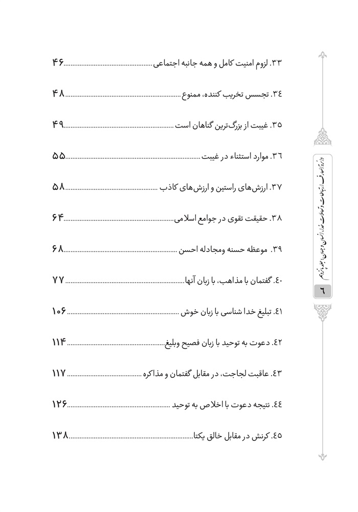 مندرجات:ج.1و 2. ارتباطات الهی و عالم هستی.- ج.3. ارتباطات و تعاملات انبیاء علیهم السلام.- ج.4 - 6. ارتباطات و تعاملات انبیاء، ائمه و اولیاء علیهم السلام.- ج.7 و 8. ارتباطات و تعاملات انسان با خداوند متعال.- ج.9. ارتباطات و تعاملات زن و شوهر.- ج.10. ارتباطات و تعاملات والدین و فرزند.- ج.11 و 12. ارتباطات و تعاملات بین مردم.- ج.13. ارتباطات و تعاملات مومنین و منافقین.- ج.14. ارتباطات و تعاملات مسلمان ها و مذاهب.- ج.15. ارتباطات و تعاملات مذاهب و امم اسلامی.- ج.16. ارتباطات و تعاملات مسلمان ها و کفار.- ج.17. ارتباطات و تعاملات حکومت اسلامی و مردم.- ج.18 و 19. ارتباطات و تعاملات بین حکومت ها.- ج.20. تعاملات در حکومت حضرت مهدی (عج).