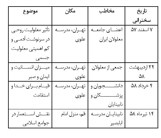 تاکنون دو مطلب مستقل به صورت مقاله درباره آراء ویژه معلولین ایشان عرضه شده است یکی از عطیه زندیه و دوم محمد نوری است. این فصل ابتدا به علل و عوامل عدم بسط و فقدان اهتمام نخبگان به آراء معلولیتی ایشان می پردازد و در ادامه به معرفی آن دو مقاله اقدام می شود.