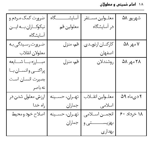 نتیجه گیری: امام خمینی چند روز پس از پیروزی انقلاب شروع به نهادسازی و ایجاد ساختار جدید برای رسیدگی به محرومین و معلولان کرد. حداقل پنج نهاد به تدریج ایجاد کرد و این نهادها شروع به اقدامات مهارت افزایی و معلولیت زدایی و رفع مشکلات معلولین کردند. این مقاله فقط به تأسیس آنها پرداخت و لازم است در تحقیق دیگر کارنامه آنها هم وارسی و بررسی گردد.