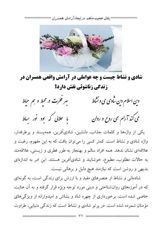 شادي و نشاط چيست و چه عواملي در آرامش واقعي همسران در زندگي زناشوئي نقش دارد؟ 71