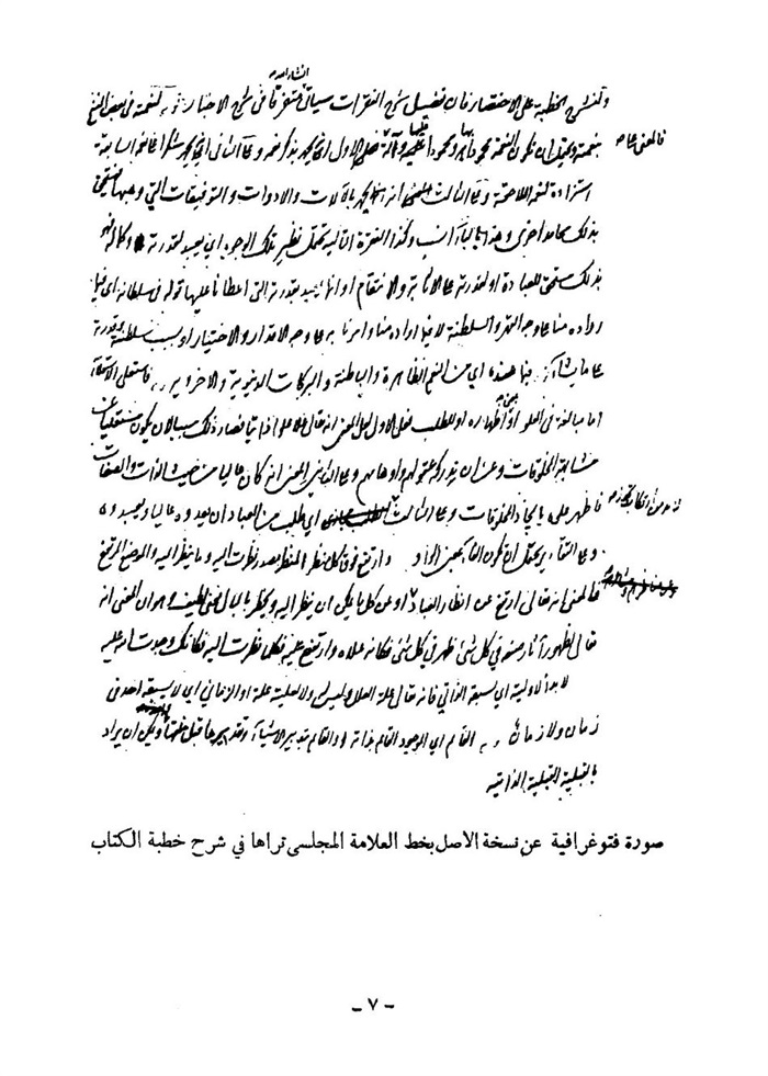 یوفقه الله سبحانه لإتمامه و سمیته بکتاب مرآت العقول فی شرح أخبار آل الرسول و أرجو من فضله تعالی و إنعامه أن یوفقنی لإتمامه علی أبلغ نظامه و أن ینفع به عامّه الطالبین للحق المبین و أن یجعله ذریعه لنجاتی من شدائد أهوال یوم الدین و الحمد لله أوّلا و آخرا و صلی الله محمّد و أهل بیته الأکرمین و لنشرح الخطبه علی الاختصار فإنّ تفصیل شرح الفقرات سیأتی إنشاء الله تعالی متفرقا فی شرح الأخبار.